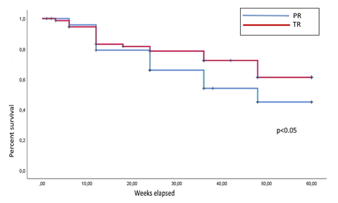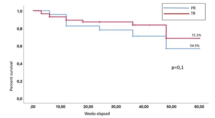 Complete healed lesions, such as ischemic ulcers or wounds from small amputations, were considered as healed wounds. Regardless of whether the wound state improved, an open wound 12 months after revascularization was not considered as a healed. Given that two of the 23 patients in the first group experienced rest pain without a tissue loss, the study revealed that 16 patients in the PR group experienced complete wound healing within the 12-month period with a 64% healing rate. Ten patients in the TR group experienced rest pain, and 81.3% (70 of 86) of the patients had healed wounds after a year. Additionally, revascularization outcomes according to PR and TR were shown to be better in TR group for the wound healing period (.9±2.2 months versus 6.7±2.8 months). In general, the results of revascularization using TR are better in terms of the rate and duration of wound healing than PR; however, since the outcomes of revascularization of PR are comparable in case amputation free survival, PR revascularization can become a fully viable alternative when revascularization of the lower limb is not possible using TR. The average follow-up period was 33.03±2.8 months in the PR group and 35.5±3.1 months in the TR group.  | Figure 1. Amputation free survival for 5 years |