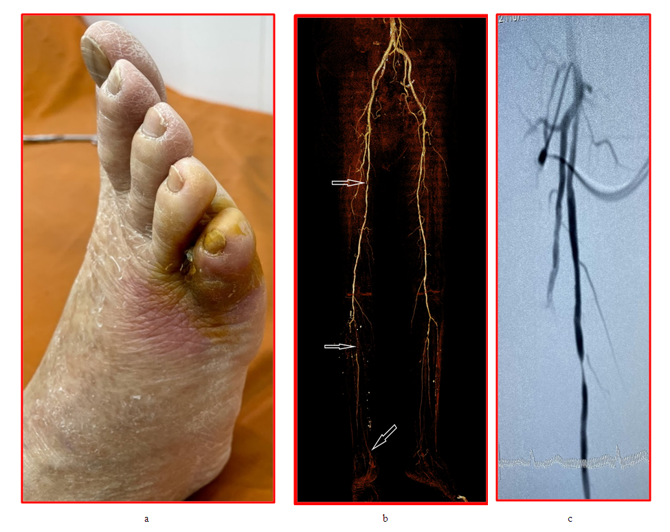 | Figure 3. a) - Gangrene of the right fifth toe, b) CT angiography - focal occlusion of the SFA (arrow), focal occlusion and stenosis of the tibioperoneal trunk and PA (arrow), extended occlusion of the ATA and PTA, the dorsal artery of the foot is contrasted through the collateral arteries plantar arteries (arrow), c) digital subtraction angiography - focal subocclusion of the SFA |
