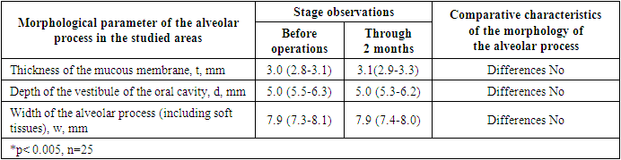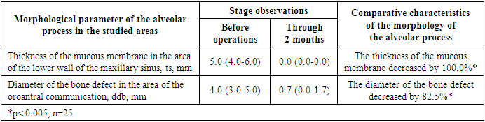 After the surgical intervention, we carried out daily examinations and dressings, as well as recording dynamic changes in the clinical manifestations of the postoperative inflammatory process on days 3, 7, 10 and 14 based on scoring characteristics. Assessing the hyperemia of the mucous membrane in the postoperative area, we observed that the severity of this manifestation of the inflammatory process was characterized as moderate 2.0 points (1.0-2.0) and significantly regressed (on average) by 7 and 10 days, and by 14 completely was allowed. The low invasiveness of the surgical technique was confirmed, in particular, by the absence of collateral edema at all time intervals, which, in our opinion, is associated with the absence of large area full-thickness flaps (with trauma to the periosteum) and the absence of soft tissue mobilization techniques. We assessed wound bleeding during meals as insignificant during the first 3 days after surgery. According to patients, bleeding occurred due to trauma recipient zone when brushing teeth or breaking the diet, it was also noted that bleeding stopped quickly and spontaneously. When surveying patients regarding the severity of pain symptoms, patients noted that pain of minor intensity was present only during the first 3 days.Based on the data obtained, we concluded that patients fully recovered after surgery within 14 days, as well as the absence of complications such as pain, swelling or recurrence of perforation until the day of suture removal when carrying out a complex method of treatment of acute perforated maxillary sinusitis, developed by us.We recorded changes in the morphological parameters of the alveolar process in patients of the main subgroup before and after 3 months of surgery, which is presented in Table 1.Table 1. Morphological characteristics in the area of the alveolar process of the upper jaw in the area of the oroantral communication and 3 months after surgery in subgroup 2-a  |
