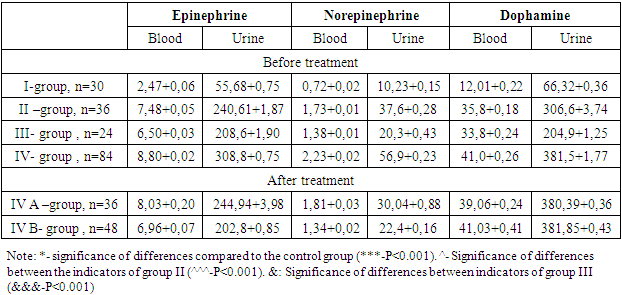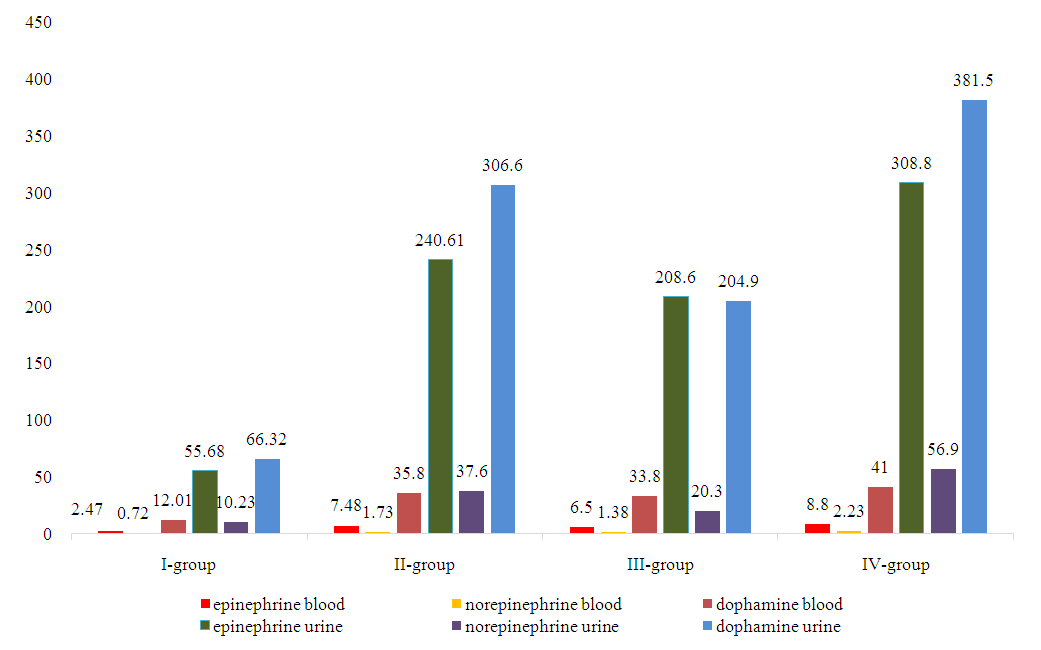 When studying catecholamines in the blood serum of the examined groups, it was found that the levels of adrenaline, norepinephrine and dopamine in the blood serum were statistically significantly higher in patients with arterial hypertension compared with control groups. For example, in the group of hypertensive patients working in the quality control department, adrenaline was 7.48±0.08 nmol/l, norepinephrine - 1.73±0.02 nmol/l, dopamine - 35.2±0.27, according to compared to the control group - 3.0 times; norepinephrine increased by 2.4 times, dopamine by 2.9 times (P<0.001). In the group of patients without hypertension, serum catecholamine levels were as follows. Adrenaline-6.5±0.04 nmol/l, Norepinephrine-1.38±0.01 nmol/l; Dopamine - 33.8±0.43 nmol/l, adrenaline - significantly exceeded the control group by 63.1%, adrenaline - 15.1% decreased compared to group II.The values of norepinephrine were significantly higher than in the control group by 1.9 times (P<0.001), and the values were 25.3% lower than in group II. Dopamine values were significantly higher than in the control group by 2.8 times; compared to group II, the values decreased by 1.06 times; the values did not differ significantly (Table 1, Diagram 1).A study of the daily excretion of catecholamines revealed a statistically significant increase in the total urinary excretion of adrenaline, norepinephrine, dopamine, including adrenaline in the control group - 55.68±0.75 ng/ml, in patients with office hypertension - 240.61±1, it was 87 ng/ml and was significantly 4.3 times higher than in the control group, adrenaline in patients of group III was 208.6±1.90 ng/ml and was 3.7 times higher than in the control group, and compared to group II it was 1. It was found that excretion decreased by .2 (r<0.001). In group IV, that is, in the group with hypertension at a distance, adrenaline was 308.8±0.75 ng/ml and was 5.5 times higher than in the control group (p<0.001), by 28.3% compared with group II, and in comparison group III it was higher by 48.1% (r<0.001) (Table 1, diagram 1).It was found that the daily excretion of norepinephrine statistically increased. In the control group, norepinephrine was 10.23±0.15 ng/ml. Norepinephrine-37.6±0.28 ng/ml was significantly increased by 3.7 times compared to the control group in employees diagnosed with arterial hypertension (group II). In patients of group III, it was significantly higher by 1.9 times compared to the control group, and compared to group II, these indicators changed, that is, the excretion of norepinephrine significantly decreased by 53.9% (p <0.001).Urinary excretion of biogenic amines was statistically significantly increased in long-distance hypertensive travelers compared with other groups. The dopamine index was 381.5±1.77 and was significantly 5.7 times higher than the control group, 24.1% higher than group II and 86.2% higher than group III (r<0.001) (Table 1, diagram 1).Table 1. Levels of CA excretion in the study and control groups before treatment (M±m, ng/ml)  |