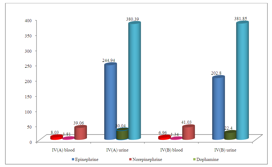 In IVA group employees with blood pressure over long distances, i.e. in our group, who received the Aevit tablet in addition to standard treatment, the amount of adrenaline was 8.03 + 0.20 ng/ml, which decreased by 9.6% from the value before treatment. and in our group IWB, i.e. in our group, i.e. in addition to standard treatment, Mexidol was given; in our group, the amount of adrenaline in the blood was 6.96 + 0.07 ng/ml, which decreased by 26.4% from the initial treatment and was closed to normal. Adrenaline in urine decreased by 26.1% in the IVB group, by 34.3% in the IVB group, approaching normal.In group IVA, the amount of norepinephrine in the blood after treatment decreased by 18.8%, and in group IVB - by 39.9%. The amount of norepinephrine in the urine decreased by 1.9 times in the IVA group, and by 2.5 times in the IVB group. The amount of dopamine in the blood decreased by 4.7% in the IVA group, practically no changes were observed in the IVB group, in the urine it decreased by 0.29% in the IVA group, and no significant changes were observed in the IVB group. | Diagram 2. The amount of catecholamines after treatment among workers of the transport department of the UZ-AUTO MOTORS company. (* - P<0.05; ** - P<0.01; *** - P<0.001) |