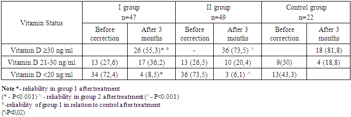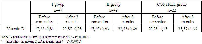 Analysis of the frequency of distribution of children with different vitamin D levels showed that the frequency of children with normal vitamin D levels between the 1st group who received vitamin D in the same dosage for 3 months and the control group was statistically different (p<0.02), whereas with the 2nd group of children who received vitamin D according to the scheme depending on body weight, there was no static dependence (p>0.5), which indicates a significantly better result in group II, and an approximation of positive results to the indicators of children in the control group. Along with obvious positive shifts in the frequency of distribution of vitamin D availability, it was revealed that following the course of correction, the level of Vitamin D in blood serum increased statistically in both groups compared with the initial examination, so in the first group, the median Vitamin D before treatment was 17.26±0.81 ng/ml whereas after 3 months of taking cholecalciferol, the average vitamin D level D in blood serum approached the reference values - 29.87 ± 0.98 ng/ml, while even if the target vitamin D level was not reached, the difference with the level of vitamin D intake at the beginning of administration and at the end of administration was statistically significant (p<0.001) (Table 2).Table 2. Comparative analysis of the dynamics of the growth of level 25(OH)D on the background of vitamin D therapy in the comparison groups and in the control group  |