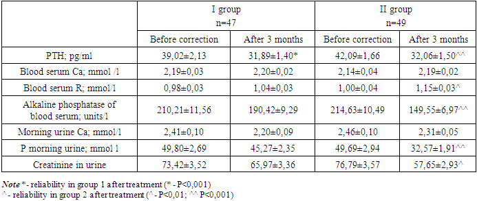 Taking cholecalciferol preparations, depending on body weight, contributed to optimizing the level of vitamin D in blood serum to reference values, with vitamin D levels at the beginning of administration 17.10±0.93 ng/ml to 32.83 ±0.89 ng/ml, which was also statistically distinguishable similar to the first group (p<0.001). When comparing the average vitamin D level of the main groups with the control group, it was found that there was no statistical difference between them (p>0.5), which indicates a positive trend in increasing the average vitamin D level in overweight and obese children and their indicators approaching the norm (Table 2.). It was of interest to us to study the level of phosphorus-calcium metabolism after taking cholecalciferol after 3 months of taking it. It should be noted that against the background of vitamin D intake, the level of PTH activity significantly decreased in both groups: in the first group from 39.02±2.13 pg/ml to 31.89±1.40 pg/ml (p<0.001), and in the second 42.09±1.66 pg/ml to 32.06±1.50 pg/ml (p<0.001). The median total serum calcium remained at the same level, this is due to the fact that if before treatment the normal average was achieved by a significant difference in serum calcium levels from 1.5 mmol/l to 2.5 mmol/l against a background of high PTH, then after treatment in the groups the calcium level returned to normal: with an increase in children with reduced levels, and with a decrease in children with its high level (Table 3). The same trend applied to the level of morning urine Ca. The dynamics of calcium-phosphorus metabolism levels against the background of vitamin D intake in the form of normalization of total Ca in blood and urine indicates an increase in calcium reabsorption in the kidneys as a result of the achieved normal supply of vitamin D. The positive dynamics in phosphorus-calcium metabolism was evidenced by a decrease in the activity of alkaline phosphotase, which decreased in group 1 from 210.21±11.56 U/l to 190.42±9.29 U/l (p>0.5) and in the second from 214.63±10.49 U/l to 149.55±6.97 U/l (p<0.001). Table 3. Comparative analysis of the dynamics of the average level of phosphorus-calcium metabolism indicators against the background of vitamin D correction in the comparison groups and in the control group  |