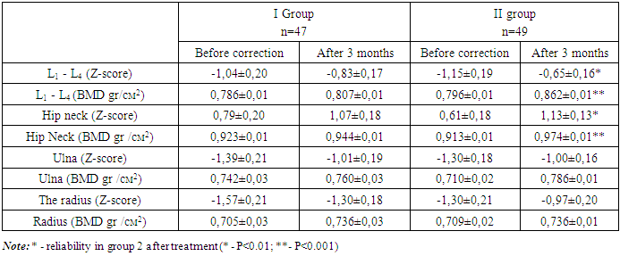 The positive dynamics in relation to normalization of blood and urine calcium levels was evidenced by a significant improvement in blood and urine phosphorus in children who received vitamin D for 3 months in group II (from 1.00±0.04 mmol/l before treatment to 1.15±0.03 mmol/l after treatment; p<0.01 serum phosphorus; from 49.69±2.94 mmol/l to 32.57±1.91 mmol/l; p<0.001 urine phosphorus). The improvement in vitamin D availability and the positive dynamics in phosphorus-calcium metabolism contributed to the study of X-ray densitometry indicators at several points of the skeleton. X-ray densitometry performed after 3 months of treatment with cholecalciferol against the background of the main treatment showed that there were no statistically significant improvements in results against the background of overall positive dynamics in group I (Table 4). In the second group, against the background of differentiated vitamin D deficiency therapy with an overall improvement in the results of densitometry, statistically significant indicators were observed with respect to an improvement in the Z-score of the femoral neck from 0.61±0.18 to 1.13±0.13 (p<0.01), as well as in indicators of bone mineral density in the femoral neck (BMD gr/cm2) from 0.913±0.01 g/cm2 to 0.974±0.01 g/cm2 (p<0.001). Also, a statistically positive result was observed in the indicators of rengenological densitometry of the lumbar spine (L1 - L4), so the Z-score indicator after 3 months of treatment increased from -1.15±0.19 to -0.65±0.16 (p<0.01), this was also accompanied by a statistically significant improvement in bone mineral density 0,796±0,01 gr/см2 to 0,862±0,01 gr/см2 (р<0,001).Table 4. Comparative analysis of the dynamics of densitometry indicators (Z-score and BMD gr/cm2) against the background of vitamin D correction in the comparison groups  |