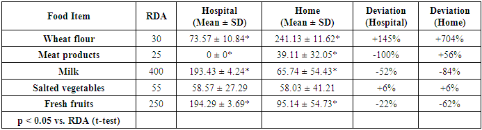 The analysis of nutrient consumption among hypertensive military personnel revealed significant deviations from recommended dietary allowances (RDAs), with notable differences between hospital and home settings.Table 1 presents a comparative assessment of key food groups, demonstrating that wheat flour consumption was alarmingly high at home (241.13 ± 11.62 g/day vs. RDA 30 g/day, p < 0.001), while hospital intake, though elevated (73.57 ± 10.84 g/day), remained closer to guidelines. In contrast, protein sources showed a stark deficit in hospital meals, with meat products entirely absent (0 ± 0 g/day vs. RDA 25 g/day), whereas home consumption exceeded recommendations by 56% (39.11 ± 32.05 g/day, p = 0.012). Dairy intake was critically low in both settings, with home consumption at just 16% of RDA (65.74 ± 54.43 g/day vs. 400 g/day, p <0.001), while hospital provision covered only 48% (193.43 ± 4.24 g/day).Table 1. Daily Food Consumption (g) vs. Recommendations  |