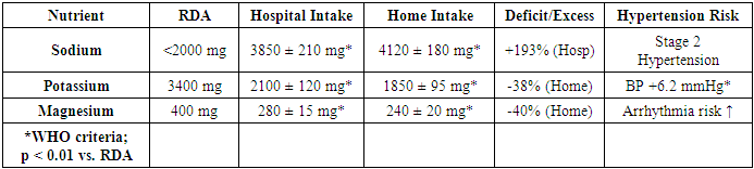 Table 2 highlights micronutrient imbalances, revealing severe sodium overconsumption (home: 4120 ± 180 mg/day, hospital: 3850 ± 210 mg/day; WHO limit <2000 mg/day) alongside potassium (home: 54% RDI, hospital: 62%) and magnesium deficiencies (home: 60% RDI, hospital: 70%).Table 2. Micronutrient Intake vs. Hypertension Guidelines  |