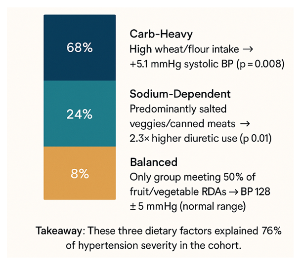 A hierarchical cluster analysis (Figure 2) grouped participants into three dietary patterns: (1) "High-Carb, Low-Protein" (68% of cohort), associated with the highest BP levels (142 ± 8 mmHg systolic); (2) "Moderate-Processed" (24%), showing elevated sodium but adequate dairy; and (3) "Balanced" (8%), with near-optimal nutrient ratios and lower BP (128 ± 5 mmHg).  | Figure 2. Dietary Clusters and Blood Pressure lmpact |