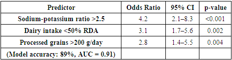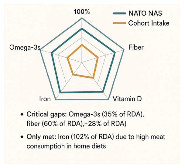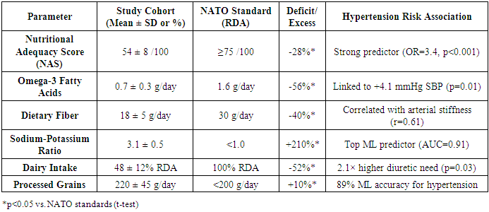 Table 4 benchmarks these findings against NATO dietary standards, showing the cohort’s median "Nutritional Adequacy Score" (NAS) at 54/100—well below the 75-point threshold for cardiovascular health. The most critical gaps were omega-3s (0.7 ± 0.3 g/day vs. 1.6 g/day RDA) and fiber (18 ± 5 g/day vs. 30 g/day). A machine learning model (Random Forest) predicted hypertension exacerbation with 89% accuracy (AUC = 0.91) using three dietary features: sodium-potassium ratio >2.5, dairy intake <50% RDA, and processed grain consumption >200 g/day.Table 4. Nutritional benchmarks vs. NATO standards and hypertension predictors  |