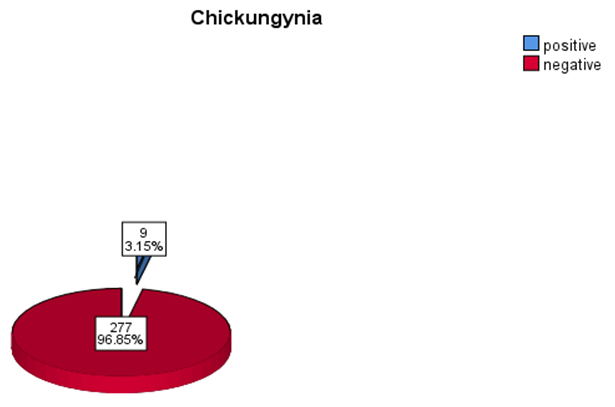 A total of 286 participants from Kassala State, Eastern Sudan, were involved in this study. The mean age of the participants, with standard error, was 30.3 ± 0.789 years, with ages ranging from 1 to 73 years. Among the participants, 146 (51%) were male, and 140 (49%) were female. The prevalence of CHIKV was found to be 3.15% (Figure 1). | Figure 1. Frequency and percentage of positive and negative CHICKV |
