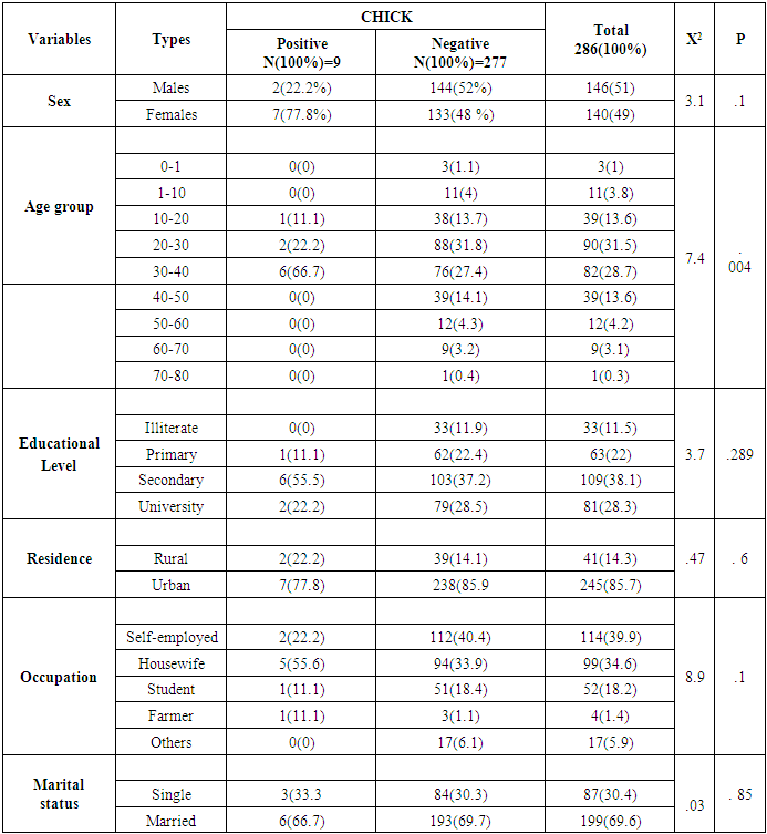 Of the nine participants who tested positive for CHIKV, 2 (22.2%) were male and 7 (77.8%) were female, indicating a higher rate of positivity among females (χ² = 3.1, P = 0.1). However, no statistically significant difference was observed between gender and CHIKV infection (Table 1).In terms of age groups, positive results were primarily found among participants aged 30-40 years, with six individuals (66.7%) in this category. A statistically significant association was noted between age group and CHIKV infection (χ² = 7.4, P = 0.004).The analysis of residence, educational level, occupation, and marital status did not reveal any statistically significant differences in relation to positive CHIKV cases (Table 1). Table 1. Association of Sociodemographic data with CHICKV infection among patients  |