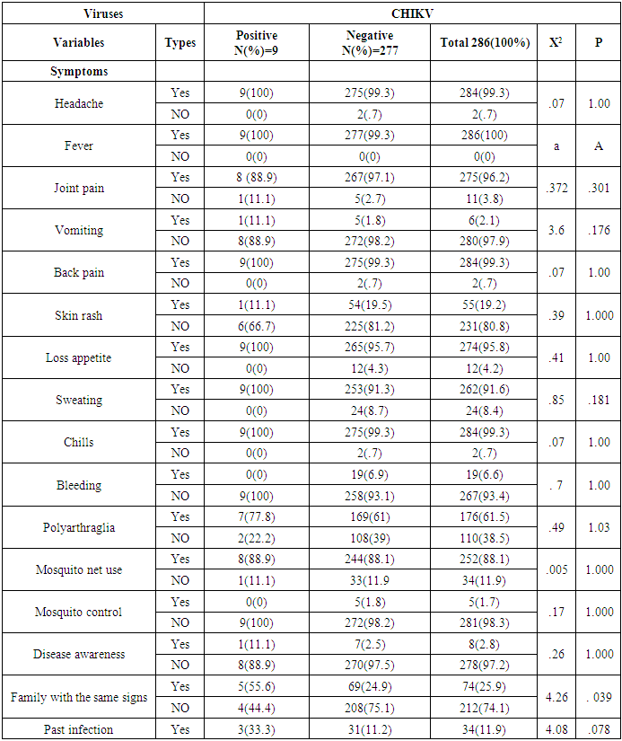 Symptoms reported by patients included fever (9, 100%), headache (9, 100%), joint pain (8, 88.9%), back pain (9, 100%), loss of appetite (9, 100%), sweating (9, 100%), chills (9, 100%), vomiting (1, 11.1%), skin rash (1, 11.1%), and no cases of bleeding (0.0%). Polyarthralgia was reported by 7 individuals (77.8%). There was no statistically significant difference between symptoms and viral infection (refer to Table 2). There was statistically significant differences in family with the same signs (χ² = 4.26, P = 0.039) (Table 2).Table 2. Associations of Symptoms data with CHIKV infection among patients  |
