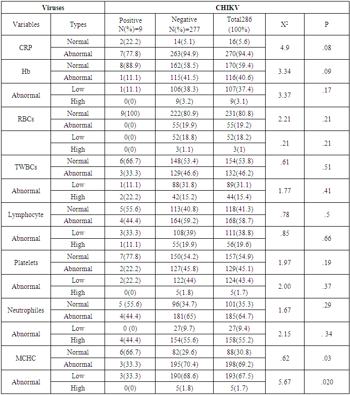 Regarding hematological parameters, both normal and abnormal findings were observed, with thrombocytopenia and lymphopenia being the most notable abnormalities. No statistically significant differences were found in relation to the virus; however, abnormal MCHC did show a statistically significant association with CHIKV infection (χ² = 0.62, P = 0.03) (Table 3).Table 3. Associations of Hematological and biomarkers data with CHIKV infection among patients  |