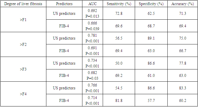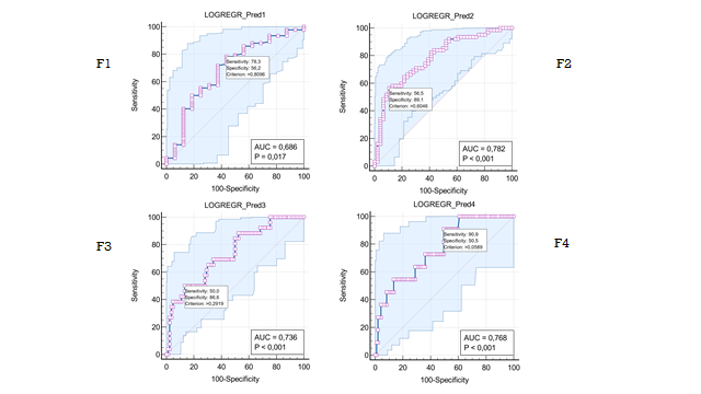 ROC curves for predicting F1, F2, F3, F4 stages of liver fibrosis (Fig. 1). | Figure 1 |