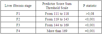 Logistic regression based on the selection of relevant and non-multicollinear echographic variables allows for a high-accuracy prediction of the degree of liver fibrosis in patients with chronic hepatitis.However, the use of logistic regression models is difficult to implement in practice, and therefore we used logistic regression only in the selection of relevant and non-collinear echo features with the construction of a simple scoring model for predicting the degree of fibrosis based on the rating (sum of points) of the selected echo patterns – predictors.The performance indicators for predicting significant liver fibrosis (F2), as well as severe fibrosis (F3) and liver cirrhosis (F4) using a simple scoring model based on the sum of points of the selected ultrasound features, did not differ significantly from the corresponding indicators of the logistic regression model (Table 3).Table 3. Threshold values for discrimination of liver fibrosis stages using an ultrasound scoring model  |