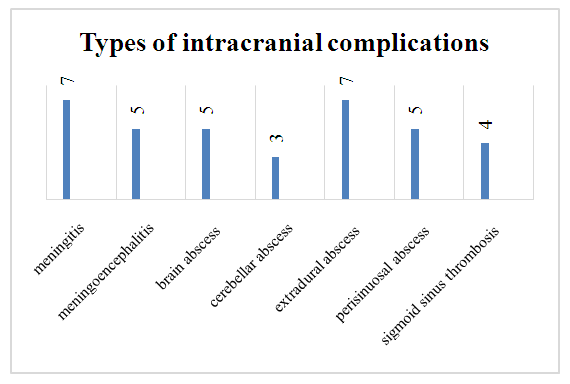 124 patients with CGSO with complications who received inpatient treatment in the last 20 years in ENT departments of Samarkand city hospitals were included in the study. Men were 68 (54,8%) and women 56 (45,2%) among the examined patients with CHSO complications. Age of examined patients from 18 to 40 years - 72, from 40 to 60 years - 36 and over 60 years - 16 patients.The study revealed that chronic purulent middle otitis media, epitympanitis was diagnosed in 81 (65,3%) patients, mesotympanitis in 19 (15,3%) and epimesotympanitis in 24 (19,4%) patients. According to the history, the duration of the disease ranged from 3 years to 30 years. The detected complications among the examined patients were local in 88 (73.0%) patients and intracranial in 36 (27.0%) patients. All patients were consulted by an otorhinolaryngologist, neurologist, neuropathologist, neurosurgeon, ophthalmologist, infectious disease specialist, therapist, clinical and laboratory tests, RheoEG, CT and MRI of the mastoid process and brain were performed.Mastoiditis was diagnosed in 38 patients, 15 with atypical forms of mastoiditis, 12 with facial nerve paresis, and 23 with labyrinthitis. Figure 1 | Figure 1 |