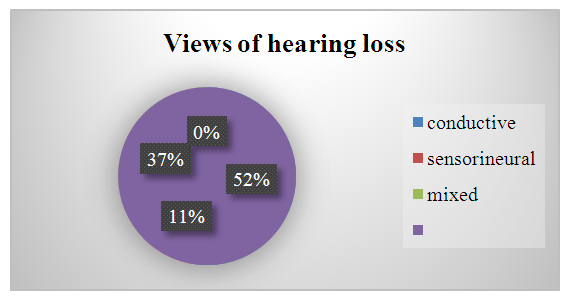 The clinical course of these pathologies was characterized by rapid progression with a marked increase in meningeal symptoms, which could develop within a few hours.Often extradural abscess was accompanied by meningitis and thrombosis of the sigmoid sinus. The main clinical manifestations in patients were intense headaches, dizziness, nausea, repeated vomiting, movement coordination disorders, chills, hyperthermia, as well as heart rhythm disturbances in the form of bradycardia or tachycardia and congestive changes in the optic disc area. Some patients with purulent meningoencephalitis had symptoms of central facial nerve damage, hemiparesis, motor aphasia and other general cerebral symptoms.In patients with otogenic meningitis, lumbar puncture revealed increased liquor pressure up to 180-250 mm of water column. Protein content in cerebrospinal fluid varied from 0.66 to 6 g/l and was accompanied by positive Pandy and Nonne-Apelt reactions. Pleocytosis in the liquor reached 3500 cells in 1 mm³.The state of hearing was investigated using acumetry, tonal threshold, suprathreshold, speech and computerized audiometry. The clinical results of audiologic examination in the examined patients were classified depending on the form of hearing impairment and the degree of hearing loss. Analysis of the data shows that in the majority of the examined patients hearing loss is conductive in nature, accounting for 77 (52.0%) of the total number of patients. 55 (37.2%) patients have mixed type hearing loss, which indicates the beginning of pathologic process involvement in the inner ear. In 16 (10.8%) patients sensorineural hearing loss was detected. Figure 3  | Figure 3 |