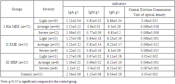 To determine the most characteristic pathological changes in the immune status in patients with GA MEE, a comparative analysis of serum immunoglobulin values was performed depending on the severity of the disease, with a comparison of the obtained values with similar values in comparison groups II and III, as well as the control group (Table 1). The results of studies conducted during a relapse are presented. Analysis of humoral immunity indicators showed that in all experimental groups there is a reliable (p<0.5) deviation from the control values according to the selected criteria. Intergroup comparison revealed a number of features.Table 1. Humoral immunity indicators in patients with HA EME depending on the severity  |