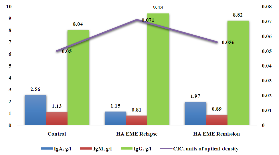All patients showed changes in the parameters depending on the severity. The IgA level in patients with HA EME was the lowest in severe cases (1.09±0.05 g/l), while in mild and moderate cases the IgA concentration in the blood serum was significantly higher - 1.21±0.04 g/l and 1.15±0.12 g/l, respectively, and in the control group 2.56±0.09 g/l (p<0.05). In the comparison groups this parameter fluctuated depending on the severity of EME and HRP, and was significantly different from the control. It is interesting to note that no reliable difference was found between these groups (p>0.05).The IgM level in patients with GA MEE is significantly lower than the control values - from 0.85 ± 0.02 g / l in the mild form to 0.77 ± 0.09 g / l in the severe form compared to the control 1.13 ± 0.06 g / l (p<0.05). However, no significant difference was found between the values in HA EME and EME (p>0.05). The values of IgM concentration in the serum of patients with HRP (group III) are as close as possible to the control, although they differ significantly from them (p<0.05) - from 0.97 ± 0.02 g / l in the mild form to 0.9 ± 0.01 g / l in the severe form.Regarding the level of IgG in the blood serum of patients in all groups, they were the highest in patients with HA EME with a severe degree of the disease - 9.85 ± 0.2 g / l, significantly decreased in mild and moderate degrees of HA EME - 8.86 ± 0.34 and 9.3 ± 0.29 g / l, but still significantly exceeded the control values - 8.04 ± 0.59 g / l.In patients with EME (group II) and HRP (group III), this indicator of humoral immunity fluctuated depending on the severity, but no significant intergroup difference was found.The assessment of the CIC level showed a reliable increase in the indicator in patients with HA EME (from 0.06±0.015 units of optical density in the mild stage to 0.068±0.008 units of optical density in the severe stage compared to the control 0.05±0.002 units of density (p<0.05) and other groups, however, the dependence on the severity within the group of patients with HA EME was not determined (p>0.05).Thus, the results of the conducted studies showed that in patients with HA EME, with an increase in the severity of the pathological process, the indicators of humoral immunity change, namely, disimmunoglobulinemia develops due to a decrease in the concentration of IgA and an increase in the level of IgG in the blood serum, as well as an increase in the level of CIC.In patients with EME and HRP included in the comparison groups, similar processes also occur, but the degree of their manifestations is significantly lower.Next, the dynamics of the concentration of the main classes of immunoglobulins in patients with HA EME during relapse and remission of the disease was studied (Fig. 1). | Figure 1. Humoral immunity indicators in patients with HA EME during periods of relapse and remission of the disease (g/l) |