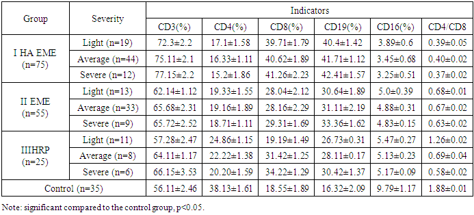 In patients during a relapse of HA EME, in contrast to the period of remission of the disease, a reliable increase in the number of CD3+, CD8+ and CD19+ lymphocytes in the blood is observed; the value during a relapse is 73.89±1.41%, 40.54±1.71%, 41.46±2,1% andin case of disease remission - 65.43±2.09%, 30.3±2.15%, 32.52±2.53%, respectively;The period of disease relapse, in contrast to remission, is characterized by a persistent increase in the number of CD19+ B lymphocytes by 1.27 times (41.46±2.1%), a decrease in CD16+ killer cells by 1.5 times (3.46±0.14%) and CD4+ T helpers by 1.57 times (17.21±2.59%);In patients with a severe course of HA EME, during a relapse of the disease, a significant increase in the blood count of CD3+ by 1.02 times, CD8+ by 1.02 times, CD19+ by 1.03 times and a decrease in CD16+ lymphocyte cells by 1.12 times is observed compared to a mild course.