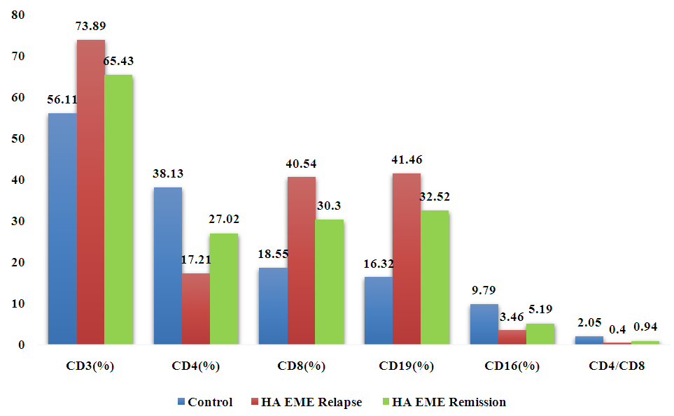 During remission, the indices of cellular immunity in patients with HA EME changed towards normalization, but the intensity of these changes and relative results were different. Improvement was registered in terms of the CD4+-cell index - the difference between the relapse period and the state of remission is 57.0%, in terms of CD16+-cells - 50.0%, the number of CD8+-cells changes less - 33.8% and CD19+-cells - 27.5%. The immunoregulatory index increases by 2.35 times compared to the relapse, but does not reliably approach the control value. At the same time, there is data on a wide range of normal values of this index - from 0.75 to 2.39. Therefore, it is possible to assume a pronounced tendency towards normalization of the T-helper/suppressor ratio (CD4+/CD8+) in patients with HA EME in remission.The average value of the total number of T-lymphocytes, defined as CD3+ cells in the examined patients with HA EME during a relapse, was at the level of 73.89±1.41%, which is significantly higher than similar indicators in practically healthy people 56.11±2.46%. During remission, a slight decrease in this indicator is observed - 65.43±2.09%. Quantitative indices of CD4+ cells, known as inducer T lymphocytes and CD16+ population of natural killers (NK cells) in patients during relapse had reduced indices (17.21±2.59% and 3.46±0.14%) compared to remission of the disease (27.02±1.29% and 5.19±0.71%), and especially with the control group (38.13±1.61% and 9.79±1.17%).The average index of CD8+ cells (T-lymphocytes) in the peripheral blood of patients with relapse of HA EME was at the level of 40.54±1.71%, which is significantly higher than the average index of healthy individuals in the control group (18.55±1.89%) and higher than the index of the remission period (30.3±2.15%).A significant decrease in the average values of CD4+ cells during the relapse period and a decrease during the remission period and an increase in the number of CD8+ cells are reflected in a corresponding decrease in the ratio index (CD4+/ CD8+). In patients with HA EME, a reliable increase in the average total number of CD19+ lymphocytes was observed during a relapse (41.46±2.1%) and to a lesser extent during remission (32.52±2.53%) compared to the control group (16.32±2.09%).