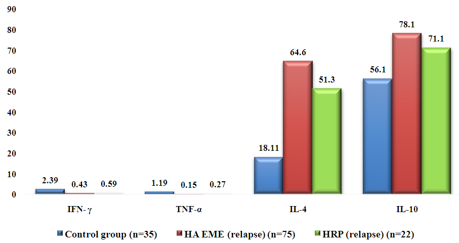 - During the relapse of HA EME, there is an increase in the concentration of cytokines IL-4 by 3.57 times and IL-10 by 1.39 times and a decrease in the level of IFN-γ by 5.56 times, TNF-α by 7.93 times in the blood serum of patients compared to the control group;- During remission of the disease, a reliable decrease in the concentration of IFN-γ by 1.59 times, TNF-α by 1.77 times in comparison with the control group and an increase in the level of IL-4 by 1.78 times and IL-10 by 1.21 times is observed;- A clear difference in the cytokine profile of patients with HA EME from patients with GRP was revealed, which may indicate the role of cytokines in the formation of HA EME.