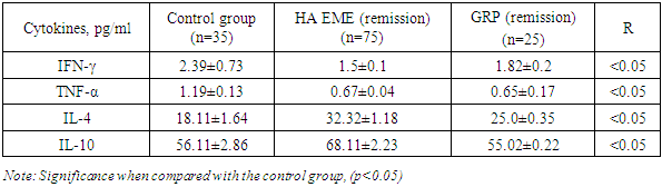 During a relapseIn patients with HA EME (Fig. 1), there is a significant increase in the concentration of cytokines produced by Th type 2 (IL-4, IL-10) - 64.65 ± 1.84 pg / ml and 78.11 ± 2.13 pg / ml, respectively, compared to the control group, where the amount of IL-4 was 18.11 ± 1.64 pg / ml, and IL-10 - 56.11 ± 2.86 pg / ml. Moreover, these indicators are also higher than those in patients with GRP - 51.28 ± 0.8 pg / ml and 71.11 ± 1.78 pg / ml, (p<0.05).In case of relapse of HA EME, a decrease in the produced Th type 1 cytokines - IFN-γ, TNF-α - was revealed. Thus, if the content of IFN-γ in the peripheral blood in the control was 2.39±0.73 pg/ml, then in case of relapse of HA EME - 0.43±0.14 pg/ml, and this is significantly less than in patients with relapse of GRP (0.59±0.26 pg/ml), (p<0.05). A similar trend with TNF-α - 0.15±0.06 pg/ml in case of relapse of GA MEE, compared to the control - 1,19±0.13 pg/ml and GRP in relapse - 0.27±0.17 pg/ml, (p<0.05).In most patients of group I, with manifestations of HA EME, an increase in the concentration of specific IgG in the peripheral blood was observed not only during relapse, but also during remission. Thus, taking into account the key role of some cytokines in the mechanism of IgG production, their difference was determined during the period of relapse and remission of the disease. The results of studies of the level of serum cytokines in patients with HA EME during remission of the disease are presented in Table 1.Table 1. Th1 and Th2 cytokine profile indicators in patients with HA EME during remission  |