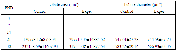 It should be noted that induced maternal diabetes mellitus negatively affects fertility processes in females — up to 62% (compared to 92% in the control group), and prolongs the gestation period up to 24–25 days (vs. 21–22 days in the control group). Also notable was the reduction in the number of pups per litter to 5.2 ± 0.31, whereas in the control group, this indicator was significantly higher — 8.7 ± 0.42. Maternal diabetes mellitus also led to increased postnatal mortality — 10.8%, which significantly exceeded that of the control group — 2.2%. The death of first-generation rats in both groups was recorded within 14 days after birth. Naturally, all deceased pups were excluded from the experiments.Morphometric changes in liver lobulesAlthough it was conditionally possible to differentiate the hepatic lobule by postnatal day (PND) 14 in the control group, it was not possible to calculate its area and diameter due to poor triad organization at the lobular periphery. Calculations were performed for postnatal days 21 and 30 of postnatal development. On postnatal days 21 and 30, there was a significant increase in lobular area and diameter in the experimental group compared to the control. On postnatal day 21, the lobular area in the experimental group was 297,710.35 ± 14,885.52 µm², while in the control group — 170,578.12 ± 8,528.91 µm². The lobular diameter was 754.59 ± 37.73 µm in the experimental group versus 545.61 ± 27.28 µm in the control. On day 30, the lobular area in the experiment reached 317,550.81 ± 15,877.54 µm², and the diameter — 666.93 ± 33.35 µm, also exceeding the control values (232,158.59 ± 11,607.93 µm² and 583.26 ± 29.16 µm, respectively) Table 1. These data indicate accelerated growth and hypertrophy of the structural liver units in offspring of diabetic mothers.Table 1. Lobule Area and Diameter  |