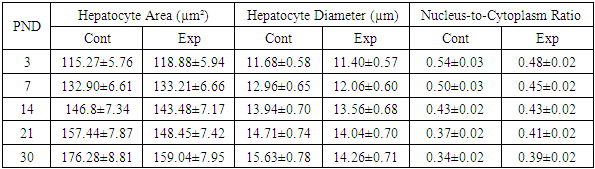 Changes in hepatocyte parametersThe area and diameter of hepatocytes increased progressively with age in both groups. However, in the experimental group, there was a tendency toward smaller hepatocyte size at later stages compared to the control. On postnatal day 30, the hepatocyte area in the control group was 176.28 ± 8.81 µm², while in the experimental group — 159.04 ± 7.95 µm². Hepatocyte diameter was also higher in the control group (15.63 ± 0.78 µm vs. 14.26 ± 0.71 µm).The nuclear–cytoplasmic ratio (NCR) decreased progressively with age, reflecting hepatocyte maturation. In the experimental group, the NCR was lower at all-time points, especially on day 30: 0.34 ± 0.02 in the control versus 0.39 ± 0.02 in the experiment. This suggests delayed cytoplasmic growth in the experimental group and potential delays in hepatocyte differentiation. Table 2.Table 2. Morphometric Parameters of Hepatocytes  |