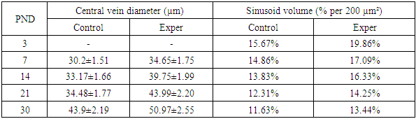 Significant differences were also found in the diameter of the central vein. On day 30 in the experimental group, it reached 50.97 ± 2.55 µm, while in the control — 43.9 ± 2.19 µm. These changes indicate possible vascular remodeling and adaptation to increased metabolic demands. The volume of sinusoids, calculated over an area of 194 µm², also showed intergroup differences. In the control group, this value gradually decreased from 15.67% on postnatal day 3 to 11.63% by day 30. In contrast, in the experimental group, the sinusoidal volume remained consistently higher: from 19.86% on day 3 to 13.44% on day 30 Table 3. Table 3. Central Vein Diameter and Sinusoids Volume  |