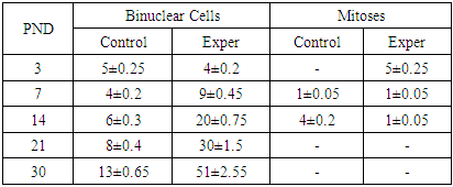 These results suggest that the increased size of liver lobules in the experimental group is due to sinusoidal dilation and the consistently elevated volume of sinusoids at all-time points.The number of binucleated hepatocytes and mitotic activity were assessed in 20 fields with a total area of 1 mm². The number of binucleated hepatocytes in the experimental group was significantly higher starting from day 7 (9 ± 0.45 vs. 4 ± 0.2) and reached 51 ± 2.55 by day 30 (vs. 13 ± 0.65 in the control). Mitotic activity was elevated in the experimental group on day 3 (5 ± 0.25 mitoses/mm²), whereas in the control, mitoses were not detected during this period. By day 14, mitoses increased to 4 ± 0.2 in the control, while in the experiment, it was only 1 ± 0.05. These findings suggest active regenerative or compensatory proliferation in response to metabolic stress Table 4.Table 4. Binuclear Cells and Mitoses Count per 1 mm²  |
