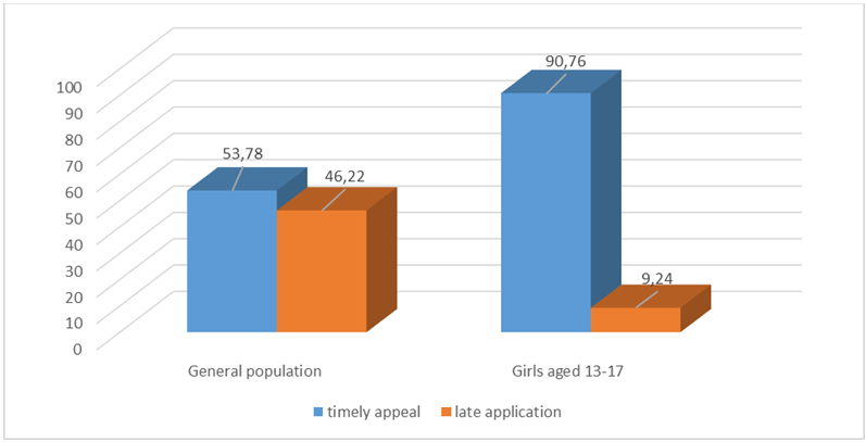 Among the general population, only 53.78% of individuals sought dental care in a timely manner, whereas 46.22% delayed their visits until symptoms worsened.In contrast, among girls aged 13–17, as many as 90.76% sought help promptly, with only 9.24% exhibiting delayed care-seeking behavior.This notable difference can be attributed to heightened aesthetic awareness and concern for personal appearance among adolescent girls. Their promptness in seeking dental care suggests a greater level of health consciousness and personal responsibility for oral hygiene compared to the general population.These findings emphasize the importance of tailoring preventive strategies to the psychological and behavioral traits of adolescents, leveraging their proactive attitudes toward health for effective early intervention.Interviews with adolescent girls confirmed this inconsistency. The most acceptable format for them was social media (50.17%), while only 12.28% found individual counseling helpful. Very few supported group discussions or printed materials. Importantly, 34.91% of girls said they were unsure about how they would prefer to receive preventive information — indicating a lack of awareness and education in this domain.Figure 2 compares the proportion of preventive dental consultations among the general population and pubertal girls in both public and private dental clinics. The blue bars represent the general population, while the orange bars indicate the data for girls aged 13–17. | Figure 2. Indicators of official appeals to specialists for primary prevention of dental diseases, % |