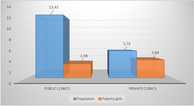 Key findings from the figure include:• In public clinics, 13.43% of the general population received preventive consultations, while only 2.98% of pubertal girls had access to such services.• In private clinics, the figures were 5.76% for the general population and 3.84% for pubertal girls.These results demonstrate an overall low level of preventive coverage across both groups, with especially limited access among adolescent girls in public clinics. The disparity suggests that preventive programs are not yet fully integrated into routine care, particularly for adolescents who may not seek dental care unless symptoms arise.This emphasizes the need for proactive outreach strategies targeting pubertal girls, as well as structural improvements to ensure that prevention is a routine part of dental services in both public and private sectors.Dentists identified several key risk factors for dental diseases in this age group. The most frequently cited were carbonated drink consumption (84.03%), poor oral hygiene (58.42%), and poor nutrition (16.81%). Girls also noted sweets as a major factor (76.14%), which dentists ranked much lower.These results suggest a disconnect between healthcare professionals' efforts and adolescents' expectations and needs. There is a clear demand for prevention programs tailored to pubertal girls integrating digital tools, age-sensitive communication, and parental involvement.