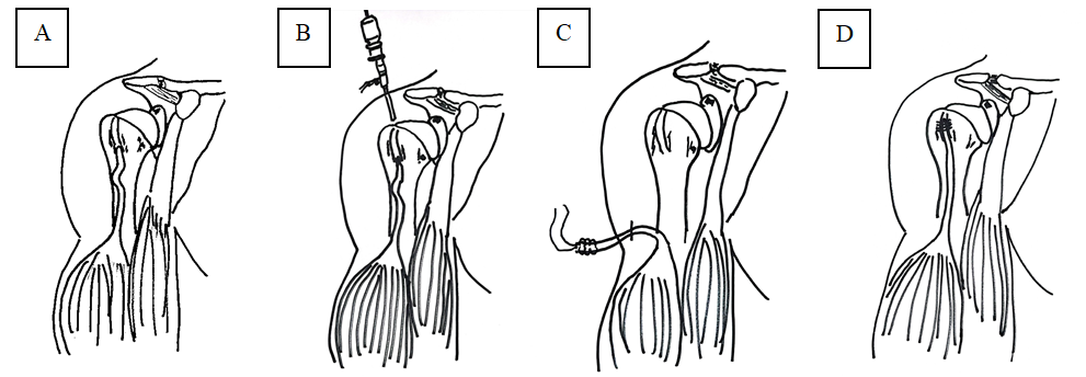 Arthroscopic tenodesis of the long head tendon of the biceps brachii muscle is a minimally invasive surgical procedure that allows preserving the function of the biceps brachii muscle, reducing the risk of complications, and accelerating the recovery process. This chapter examines in detail the technique of performing the operation, the materials used, fixators, and the criteria for evaluating the effectiveness of treatment.The main goal we sought to achieve was to increase the strength of fixation of the long head of the biceps tendon to the humerus, reduce the degree of injury, and achieve a more favorable aesthetic and plastic result of the operation.Twenty-five patients from this group were treated at the RIIATM clinic in 2022-2025, and the surgical treatment was carried out according to the new methodology we developed.Patients are prepared for surgical intervention after all the aforementioned clinical and instrumental examinations and specialist consultations. In this group of patients, surgical intervention was performed in new cases of tendon rupture.The method was implemented as follows (Fig. 1):The patient undergoes a brachial plexus block and the neck and upper arm area is treated 3 times with a 2% iodine solution. The patient is placed in a semi-recumbent position. The upper arm is abducted up to 70° from the shoulder joint and straightened at the elbow joint. The shoulder is externally rotated, and the forearm is brought to a supination position. The patient's head is turned towards the healthy shoulder.A 2 cm skin incision is made along the anterior surface of the shoulder longitudinally - 1 cm medial to the lateral bicipital groove in the upper third. The deltoid and biceps muscles are retracted laterally. The proximal part of the tendon sheath of the long head of the biceps brachii muscle is exposed. Using an electrosurgical scalpel-coagulator, the synovial part of the bicipital groove is removed. A depression is created in the proximal part of the bicipital groove using a special bone burr.Then, using a trocar, the arthroscope shaft is inserted into the distal part of the tendon through the first skin incision. The arthroscope camera is inserted through its shaft into the bicipital groove in the distal direction, and the distal part of the ruptured tendon is identified. A second longitudinal skin incision 1.0 cm long is made externally over the projection of the long head of the biceps tendon.The tendon stump is externalized and reinforced with lavsan suture, leaving the ends of the threads loose. The free ends of the sutures are inserted into the fibrous sheath through the first skin incision from the distal incision to the proximal incision and brought out. The tendon of the long head of the biceps muscle, brought to the anatomical point, is fixed to the proximal part of the bicipital groove with four transosseous sutures. The strength of the tendon repair is checked by passive extension of the arm at the elbow joint. The surgical wound is closed in layers. The arm is immobilized with a shoulder fixator for 4 weeks. | Figure 1. A. Appearance of the ruptured long head tendon of the biceps brachii muscle before surgery; B. Locating the long head tendon of the biceps brachii muscle using a joint arthroscope; C. Mobilization and fixation of the long head tendon of the biceps brachii muscle; D. Placement of transosseous sutures |