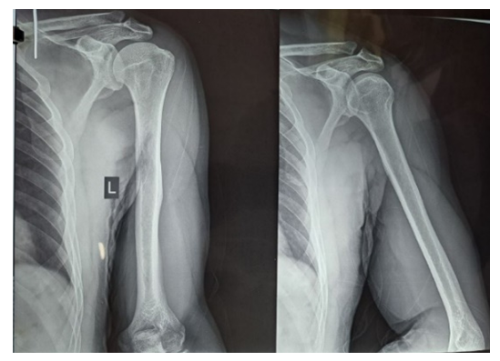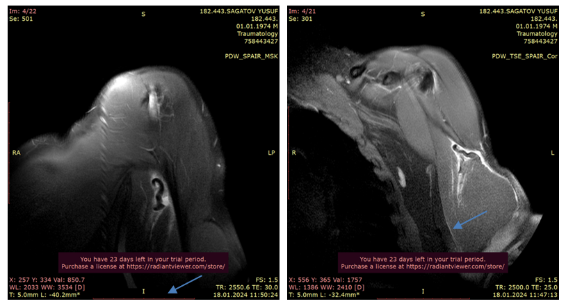 Clinical Case. Patient S.Yu., born 1974. Case No. 738/2024.The patient presents with complaints of pain and deformity in the left shoulder area. Medical history: On 14.01.2024, during a football training session, a "popping" sound was heard. After 2 days, pain, swelling, and deformity appeared. The patient underwent standard examination procedures and was diagnosed with: Rupture of the long head tendon of the left biceps brachii muscle. On 19.01.2024, the patient underwent surgical procedure No. 171 "Fixation of the long head tendon of the left biceps muscle."Ultrasound examination provided the following conclusion: Echo signs of rupture of the long head tendon of the biceps brachii muscle with hematoma formation, and tendinopathy of the rotator cuff tendons of the left shoulder joint are detected.Radiological examination revealed signs of primary osteoarthritis in the acromioclavicular joint. | Figure 2. Patient S.Yu. X-ray analysis |