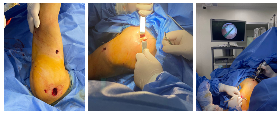 During surgical treatment, tendon fixation was performed using transosseous sutures in the intercondylar groove area. (Figure 4) | Figure 4. Patient S.Yu. The process of arthroscope insertion and tendon identification. Transosseous tendon fixation. The image shows the guides, tendon, and lavsan threads used for suturing |