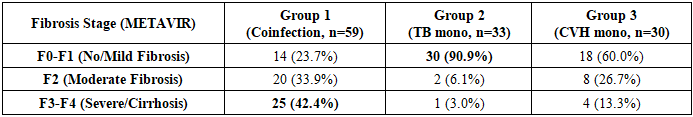 All three groups were comparable in terms of age and gender (p>0.05).Assessment of liver fibrosis via FibroTest revealed stark differences between the groups (Table 1).Table 1. Distribution of Liver Fibrosis Stages in the Groups (FibroTest)  |