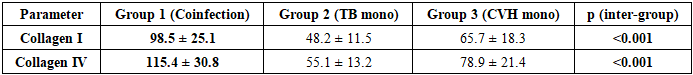 The mean levels of both collagen type I and IV were highest in the coinfection group and lowest in the TB monoinfection group. The differences among all groups were highly statistically significant (p<0.001).