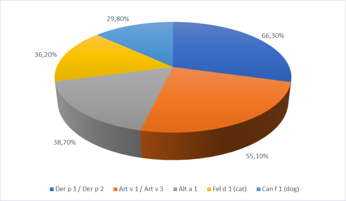The most frequent and significant positive reactions observed in our study were directed towards components of house dust mites, specifically Der p 1 and Der p 2. A substantial 119 patients demonstrated sensitization to these allergens, highlighting their dominance within the spectrum of inhalant allergies. These mites, common inhabitants of homes and bedding, release these proteins into the environment, triggering allergic responses in susceptible individuals. Der p 1, in particular, is a major allergen responsible for many symptoms associated with house dust mite allergy, including rhinitis (hay fever), asthma, and eczema. Der p 2 also contributes significantly to the allergic burden, often exhibiting cross-reactivity with other allergens.Following house dust mite allergens, the pollen components of Artemisia (Art v 1 and v 3) ranked second in terms of sensitization frequency, affecting 99 patients. *Artemisia* species, such as mugwort and wormwood, are prevalent weeds, and their pollen is a significant springtime allergen in many regions. Art v 1 and v 3 are key allergenic proteins within Artemisia pollen, known to cause respiratory symptoms and allergic reactions upon inhalation. The widespread distribution of these plants contributes to the high prevalence of Artemisia pollen allergy.Subsequently, fungal allergens, specifically Alt a 1, were identified as sensitizing agents in 70 individuals. Alt a 1 is a major allergen produced by Alternaria alternata, a common mold found both indoors and outdoors. Exposure to Alternaria spores can occur year-round, but levels often peak during late summer and fall. Sensitization to Alt a 1 is frequently associated with respiratory symptoms, particularly asthma and allergic rhinitis.Sensitization to feline epithelial proteins, primarily Fel d 1, was detected in 65 patients, while sensitization to canine components, specifically Can f 1, was observed in 54 patients. Fel d 1 is the major allergen produced by cats, found in their saliva, skin, and urine. It adheres to fur and dander, becoming airborne and triggering allergic reactions in sensitive individuals. Similarly, Can f 1 is a major allergen produced by dogs, also found in their saliva, skin, and dander. These animal allergens are persistent in the environment, even after the animal has left a room, making avoidance challenging for allergic individuals (Figure 1). | Figure 1. Frequency of Sensitization to Major Inhalant Allergenic Components |