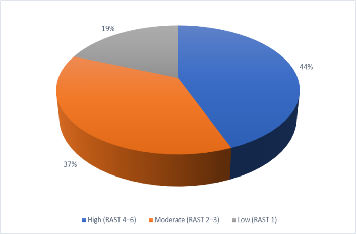 Analysis of sensitization levels based on the RAST (Radioallergosorbent Test) scale revealed a significant distribution of responses. A high degree of sensitization, indicating a strong allergic response, was present in 79 patients, necessitating mandatory clinical monitoring and specialized treatment to manage potential severe reactions. A moderate degree of sensitization was observed in 67 individuals, suggesting a need for ongoing management and potential preventative measures. Finally, a mild degree of sensitization was detected in 34 patients, indicating a lower risk of severe reactions but still warranting awareness and potential avoidance strategies (Figure 2). | Figure 2. Severity of Allergen Sensitization According to RAST Scores |
