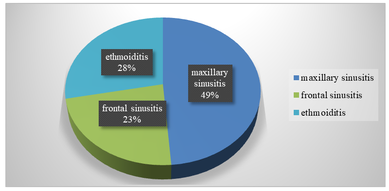 This study employed a retrospective design focusing on patients with paranasal sinus pathology and healthy individuals who underwent examinations at the Tashkent Pediatric Medical Institute from January 2025 to May 2025. The study included 200 participants, of whom 160 patients had confirmed paranasal sinus pathology, while 40 subjects comprised the control group of healthy volunteers with no signs of paranasal sinus disease according to clinical and imaging assessments.Patients with paranasal sinus pathology were subdivided according to the localization of the pathological process (Fig. 1) and the number of acquired images: frontal sinusitis — 37 patients (23.1%); maxillary sinusitis — 78 patients (48.8%); ethmoiditis — 45 patients (28.1%). | Figure 1. Clinical distribution of patients in the main study group |
