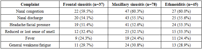 In all patients of the main group, the diagnosis was confirmed through a comprehensive examination, which included clinical evaluation, laboratory tests, and computed tomography (CT) of the paranasal sinuses. For the control group, standard MSCT was performed, confirming the absence of structural and inflammatory changes. All images were acquired in the soft-tissue window mode, ensuring optimal visualization of the anatomical structures and pathological changes of the paranasal sinuses. These images were subsequently used for training and testing deep learning algorithms. In all cases, targeted coronal projection CT scanning was performed in the Department of Computed Tomography of the hospital, providing complete CT images. We reviewed modern software solutions utilizing machine learning algorithms, deep learning, and neural networks for the analysis of medical images of the paranasal sinuses. Particular attention was given to: automatic segmentation of sinus structures; identification and quantitative assessment of areas of inflammation, cysts, and polyps; detection of signs of tumor growth; digital image quality enhancement (noise reduction, edge enhancement, multiplanar reconstruction); and automated generation of radiologic reports. The study incorporated data from international publications as well as practical experience in using radiologic processing software integrated into the radiologist’s workstation.The age of patients in both groups ranged from 20 to 40 years. Patients in the main group (n = 160) presented with complaints typical of inflammatory and chronic diseases of the paranasal sinuses (Table 1). The most common symptoms included:• Nasal congestion — observed in 96 patients (80.0%), more often bilateral, accompanied by difficulty in nasal breathing.• Nasal discharge — reported in 88 patients (73.3%), predominantly mucopurulent in nature, with an unpleasant odor in some cases.• Headache and facial pressure — present in 84 patients (70.0%), with pain localization depending on the affected sinus (frontal, maxillary, sphenoid, or ethmoidal labyrinth).• Reduced or lost sense of smell (hyposmia/anosmia) — noted in 52 patients (43.3%).• Fever — recorded in 39 patients (32.5%), mainly up to subfebrile levels.• General weakness and fatigue — reported in 48 patients (40.0%).Table 1. Distribution of main complaints among patients with frontal sinusitis, maxillary sinusitis, and ethmoiditis (proportional calculation)  |
