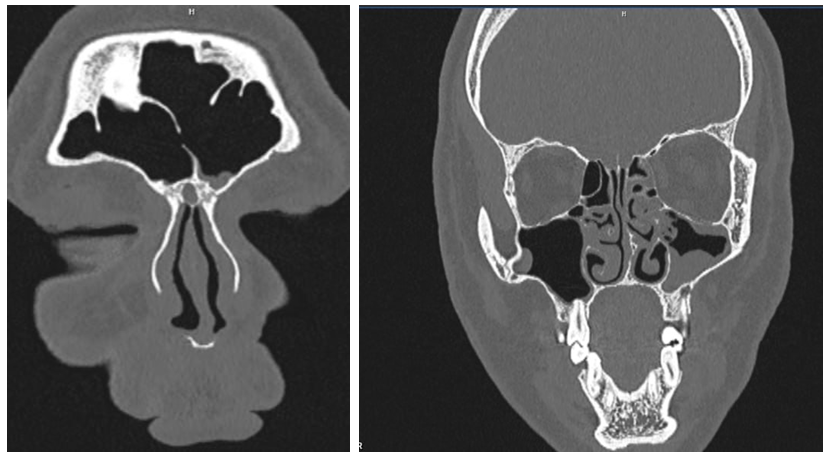 Analysis of CT images in the main patient group revealed characteristic radiologic features for each disease subgroup.In patients with frontal sinusitis (n = 37), tomograms demonstrated diffuse or partial reduction in the pneumatization of the frontal sinuses with homogeneous or loculated opacification corresponding to the accumulation of mucopurulent content (Fig. 2). In some patients, mucosal thickening up to 6–8 mm was observed, involving the frontonasal duct. In certain cases, expansion and deformation of the anterior sinus wall, as well as signs of a subperiosteal abscess, were visualized. | Figure 2. MSCT – findings consistent with left-sided frontal sinusitis. Frontal sinuses – mucosal thickening at the floor of the left frontal sinus measuring 0.4–0.7 cm, +10 to +12 HU |