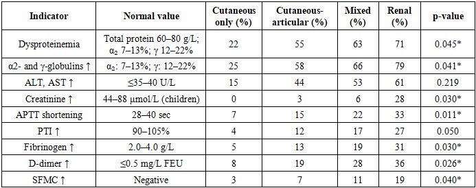 A total of 223 children diagnosed with Henoch–Schönlein purpura (HSP) were included in the study. The following clinical forms of the disease were observed:• Cutaneous-articular form – 118 children (53%),• Mixed form – 64 children (29%),• Cutaneous form only – 27 children (12%),• Renal form – 14 children (6%).Abdominal syndrome was observed in 49 children (22%), while nephritic syndrome was recorded in 16 children (7%). In most cases, the disease debuted in the autumn (40%) and spring (28%) seasons.The clinical analysis of the enrolled patients revealed that the cutaneous-articular form was the most common clinical variant, occurring in 118 children (53%). This indicates a pronounced tropism of the disease towards vascular walls and small joints. The mixed form was diagnosed in 64 children (29%), suggesting the simultaneous manifestation of several syndromes and a relatively more severe course of the disease. The isolated cutaneous form was identified in 27 patients (12%), representing a milder variant. The renal form was found in 14 patients (6%) and is of particular clinical importance, as such cases have a higher probability of chronic progression and unfavorable outcomes.Analysis of additional syndromes revealed that abdominal syndrome was present in 49 patients (22%). This was mainly associated with mesenteric vascular involvement, which manifested clinically as acute abdominal pain, bloody diarrhea, or symptoms suggestive of peritonitis. Nephritic syndrome was observed in 16 patients (7%), and its presence was recognized as one of the most significant prognostic factors for recurrence and chronicity of the disease.The analysis of seasonal distribution demonstrated that the disease most frequently debuted in autumn (40%) and spring (28%). These findings are likely related to environmental triggers, particularly seasonal infections, allergic reactions, and changes in immune system reactivity. The lower incidence during winter and summer may be explained by reduced exposure to respiratory infections and variations in immunological reactivity.In summary, the findings of this study demonstrated that HSP manifests in diverse clinical forms, with varying frequencies of presentation. The presence of nephritic and abdominal syndromes is closely associated with a more severe disease course and an increased risk of recurrence.Laboratory Findings by Clinical Forms. The detailed assessment of laboratory indicators demonstrated significant variability depending on the clinical form of Henoch–Schönlein purpura.Leukocytosis was detected in 35% of the total cohort, but its frequency differed by clinical form: it was most common in the mixed form (41%) and in the cutaneous-articular form (36%), while much less frequent in the isolated cutaneous variant (18%). Similarly, an elevated ESR (>20 mm/h) was noted in 28% of patients overall, with higher prevalence in mixed (34%) and cutaneous-articular (29%) groups compared to only 12% in the isolated cutaneous form. These findings indicate that systemic inflammatory activation is more pronounced in severe variants of the disease.Normal platelet counts were preserved in the majority (73%), but deviations showed clinically meaningful distributions. Thrombocytosis (>450×10⁹/L) was present in 18% overall, with higher rates in mixed (27%) and cutaneous-articular (22%) forms, compared to 5% in the isolated cutaneous form. Thrombocytopenia (<150×10⁹/L) occurred in 9% overall, but was disproportionately concentrated in the renal form (25%), with lower rates in mixed (8%) and cutaneous-articular (7%) variants. This strongly suggests that thrombocytopenia is associated with renal involvement and worse prognosis.Dysproteinemia was detected in 58% of cases, again most common in the renal (71%) and mixed (63%) groups, less so in cutaneous-articular (55%) and minimal in the cutaneous form (22%). Elevated α₂- and γ-globulins were found in 61% overall, peaking in renal (79%) and mixed (66%) patients, indicating pronounced humoral immune activation. Elevated transaminases (ALT/AST) occurred in 48% of children, more frequently in mixed (53%) and renal (61%) forms than in cutaneous (15%). Elevated creatinine was relatively rare (6%), but strongly associated with the renal form (28%), highlighting its prognostic significance.Coagulation disturbances were among the most clinically relevant findings. A shortened APTT was documented in 19% of all patients, with the highest rates in renal (33%) and mixed (22%) forms. Increased prothrombin index (PTI) was observed in 14%, again more common in renal (27%) and mixed (17%) cases. Elevated fibrinogen (>4.5 g/L) was recorded in 15%, more frequent in renal (31%) and mixed (19%) patients. D-dimer elevation was one of the most striking findings, present in 25% overall but highest in renal (36%) and mixed (28%) groups. Soluble fibrin-monomer complexes (SFMC) were increased in 9%, most common in renal (19%) and mixed (11%) cases.Table 1. Distribution of Laboratory Abnormalities by Clinical Forms of Henoch–Schönlein Purpura in Children  |