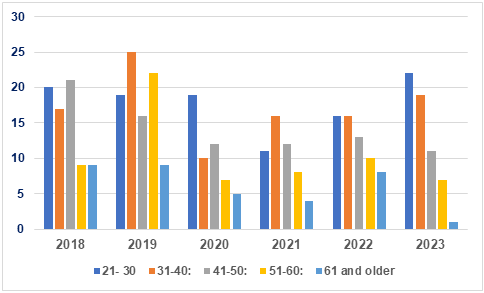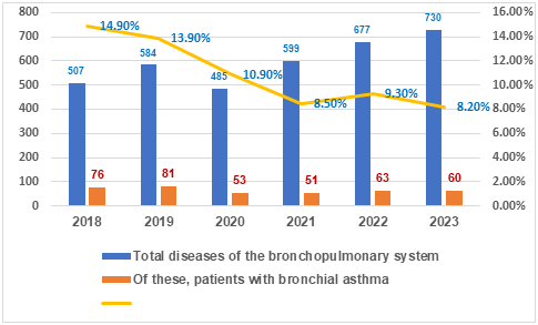 According to the analysis of patients admitted to the emergency medicine department, it was revealed that the number of patients with diseases of the bronchopulmonary system gradually increased from 507 patients in 2018 to 730 patients in 2023. Among them, the number of patients with bronchial asthma decreased from 76 in 2018 to 60 in 2023. In percentage terms, the number of patients with bronchial asthma in 2018 was 14.9%, and in 2023 it decreased to 8.2% of patients, Fig. 1. | Figure 1. Number of patients admitted with asthma over the past 6 years |