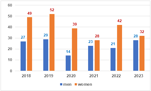 The number of women among emergency patients with asthma was 1.5-2 times higher than men in 2019-2020 and in 2022, and in 2021 and 2023 this difference was insignificant, Fig. 2. | Figure 2. Ratio of men and women among patients with bronchial asthma |