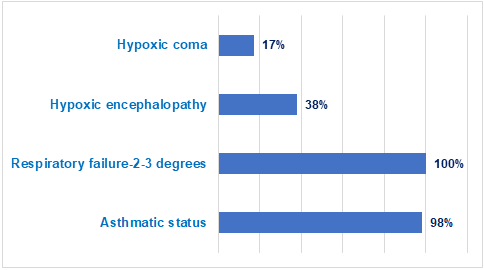 Analysis of the clinical condition of patients admitted to the emergency medicine department in 2022 and 2023 showed that all patients were admitted in asthmatic status with respiratory failure of grades 2 and 3. Hypoxic encephalopathy was detected in 38% of them, and 17% were even in hypoxic coma, Fig. 4. | Figure 4. Severity of the condition of patients with asthma upon admission |