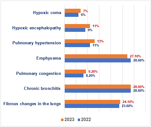 All patients underwent fluoroscopy and chest radiography, MSCT, peak flowmetry, ECG. The changes detected in the lungs of patients hospitalized in 2022 and 2023 are almost the same - they were diagnosed with emphysema, chronic bronchitis and fibrotic changes in the lung parenchyma after a history of COVID infection, Fig. 5. | Figure 5. X-ray changes in the bronchopulmonary system of patients with bronchial asthma |