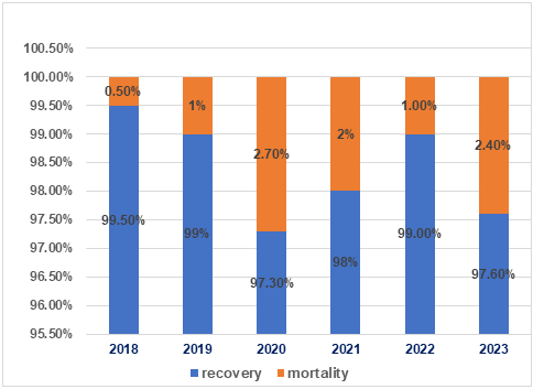 Laboratory blood diagnostics showed that these patients had reduced hemoglobin and platelets, but increased hematocrit and blood clotting parameters.Combined bronchodilators for inhalation, anticoagulants for the prevention of pulmonary embolism, pirfenidone, nintedanib, longidaza were added to the traditional treatment tactics: oxygen therapy, corticosteroids (prednisolone, dexamethasone and methylprednisolone).It should be noted that patients in these years (2022 and 2023) had cases of repeated re-admission with asthmatic status during the year.Finally, the next criterion for the course of the disease among patients with bronchial asthma was the outcome of the disease after treatment in the emergency department. Over the past 6 years, the highest percentage of recoveries 99-99.5% was in 2018-2019, whereas in 2020-2021, due to the impact of the pandemic, cases of death among patients with asthma increased to 2.7%, and in 2023, death was recorded in 2.4% of patients with asthma, Fig. 6. | Figure 6. Outcome of bronchial asthma |