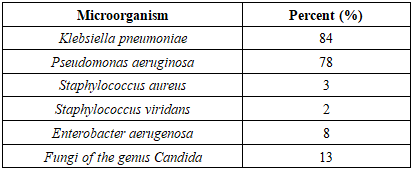 Microbial landscape and antibiotic resistance analysis data were used to determine antibiotic sensitivity, which was distributed as follows: ceftriaxone 3%, ceftriaxone + sulbactam 84%, amikacin 82%, ciprofloxacin 86%, pefloxacin 23%, levofloxacin 81% (Tab. 1).Table 1. Microorganisms isolated during bacteriological examination in patients on mechanical ventilation  |
