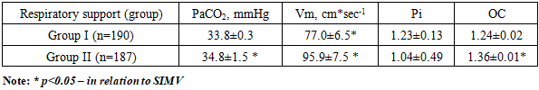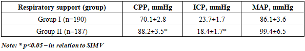 The study included 377 patients who were treated in the neurosurgical intensive care unit of the Republican Research Center of Emergency Medicine from 2019 to 2024. Only patients with combined severe traumatic brain injury (SCTBI) in whom nosocomial pneumonia (NP) was developed against the background of ongoing mechanical ventilation and based on the results of clinical and radiological examination were included in the comparative analysis. The mean age of men was 37.62±12.07 years (18-59 years), while the mean age of women was 41.07±12.66 years (21-58 years). Level of consciousness was not less than 7 points on the Glasgow Coma Scale. The inclusion criterion was a duration of mechanical ventilation exceeding 48 hours. The diagnosis of NP was considered probable in the presence of at least two of the following signs: body temperature above 38°C or below 36°C; white blood cell count >12×10⁹/L or <4×10⁹/L; appearance of new infiltrates on the radiograph; purulent nature of sputum.All patients underwent a clinical and neurological examination, monitoring of laboratory parameters (complete blood count, acid-base balance, arteriovenous oxygen difference - AVDO₂, hemoglobin oxygen saturation in the jugular vein - SO₂). The gas composition was studied in capillary, arterial and venous blood. The parameters were recorded at least 4 times a day on the EasyStat gas analyzer (Medical, USA), Roche OMNI C (Japan) from the blood of the radial or femoral artery, internal jugular vein with the calculation of the arteriovenous oxygen difference (AVO2) and the oxygen extraction coefficient (OEC). Measurement of cerebral hemodynamics. In patients of the second stage, cerebral blood flow was additionally examined using an HD 11 XE ultrasound scanner (Philips). The following hemodynamic parameters were evaluated through the middle cerebral artery (MCA): average linear blood flow velocity (Vm, cm/s); pulsatility index (Pi), characterizing vascular resistance; overshoot coefficient (OC), reflecting the dilation reserve. Standard access – temporal “window”. Calculation formulas:• Pi = (Vs – Vd) / Vm,• Vm = (Vs + 2Vd) / 3,• OC = V₂ / V₁ (based on the results of the carotid compression test).The studies were conducted on the 2nd day of admission and on the 7-8th day of hospital stay.In case of autoregulation disorder, intracranial pressure (ICP) was calculated using the formula: ICP = APm × RI × Vm⁻¹, where RI = (Vs – Vd)/Vs.Systemic hemodynamic indicators. Assessed by mean arterial pressure (MAP) and cerebral perfusion pressure (CPP): CPP = АDs × Vm × Vm⁻¹, where АDs — systolic blood pressure.Upon admission to the intensive care unit, patients received respiratory support in traditional SIMV VC, SIMV PC, and BiPAP modes (Drager, Hamelton device), as well as vibroacoustic therapy (VAT) using the “VibroLUNG” device. VAT is a non-invasive procedure of intensive vibroacoustic and resonance stimulation of the chest wall, both on the lung parenchyma and on the airways. [13-14]. The method is used for obstructive and restrictive pathology and inflammatory diseases of the lungs; it improves ventilation parameters by opening the functional reserve of the lungs, improving the drainage functions of the tracheobronchial tree and redistributing pulmonary perfusion. Vibroacoustic therapy also plays a significant role in the complex of resuscitation measures for respiratory failure.The VAT "VibroLung" device affects the respiratory tract with a generated sound signal from a bifocal position by two emitters in the range of 20-300 Hz. The floating effect of the sound wave causes a resonance effect, which has a safe and efficient impact on any type of damage to the lung parenchyma itself, as well as the bronchial tree, alveoli, and vessels. It allows to achieve better results with less intensity and exposure time, which is due to the oscillation of the vibroacoustic wave in the inhomogeneous pulmonary parenchyma and intrapulmonary component (edema, mucus, infiltration, hypostatic transudate), which improves drainage, ventilation, aeration, and reduces infiltration and proliferation [13-14]. The use of VAT against the background of mechanical ventilation reduces the area of lung collapse and atelectasis due to the effect on external pressure, the evacuation of bronchial secretions, promotes the acceleration of the processes of gravitational redistribution of intrapulmonary fluid and the improvement of ventilation-perfusion ratios. This, in turn, potentiates РЕЕР without additional increases in ventilation parameters.All patients initially received antibiotic therapy according to a protocol developed based on two regimens:• regimen 1 - cefoperazone/sulbactam 4 g/day + amikacin 1500–2000 mg/day;• regimen 2 - cefoperazone/sulbactam 4 g/day + levofloxacin 1000 mg/day.Subsequently, antibiotic therapy was adjusted based on the results of bacteriological studies.Patients were divided into two groups depending on the method of respiratory support:• Group I (n=190) — traditional mechanical ventilation, average duration - 10.9±1.3 days. The following modes were used: SIMV: FiO₂ 40–50%, Pasb 20–25 mbar, Pins 10–25 mbar, PEEP >7 mbar;• Group II группа (n=187) — a combination of traditional mechanical ventilation (SIMV) with vibroacoustic therapy (VAT) using the “VibroLUNG” device. The procedure lasted 5 minutes and was administered 3 to 10 times per day. The average duration of mechanical ventilation was 8.3±1.2 days. All patients in all groups were individually selected for mechanical ventilation parameters. Efficiency was assessed based on the following parameters: SpaO₂ — 96–99%, PaCO₂ — 34.7–35.2 mmHg., С, VCO.Data analysis was performed using STATISTICA 10 (StatSoft, Inc., 2011). The significance of differences was assessed using the Pearson χ² test at a p<0.05 level.